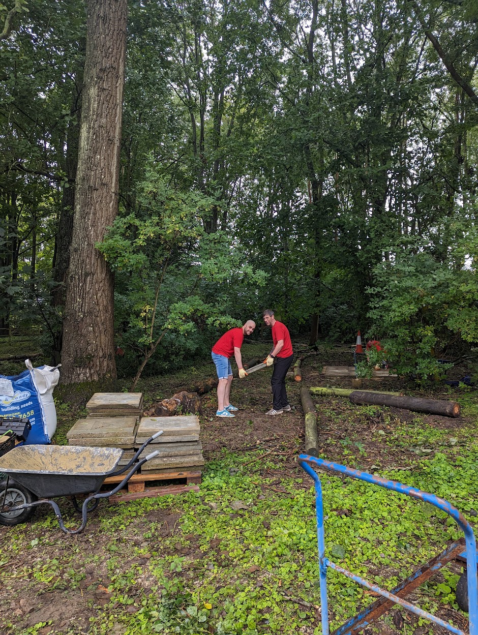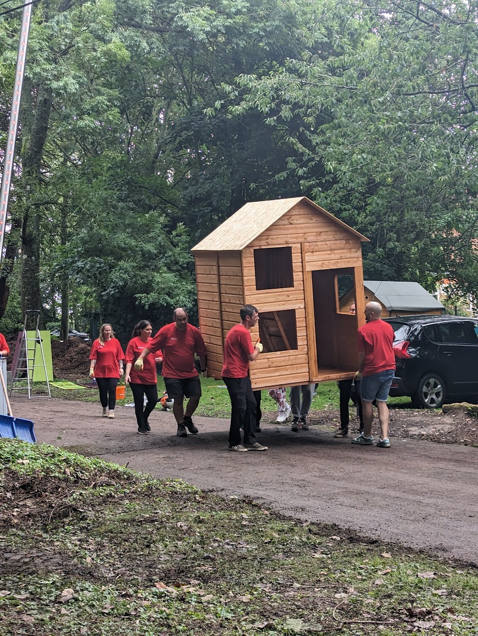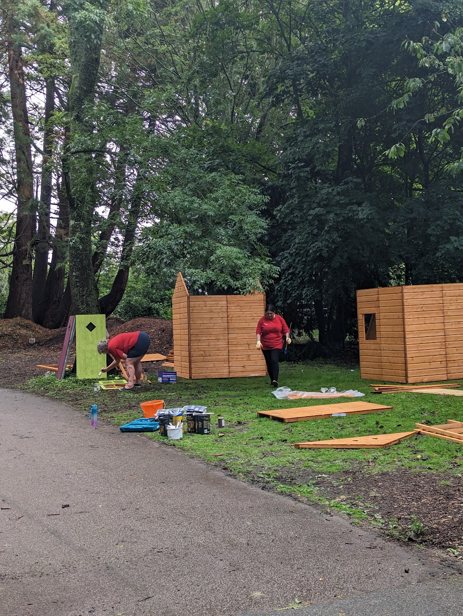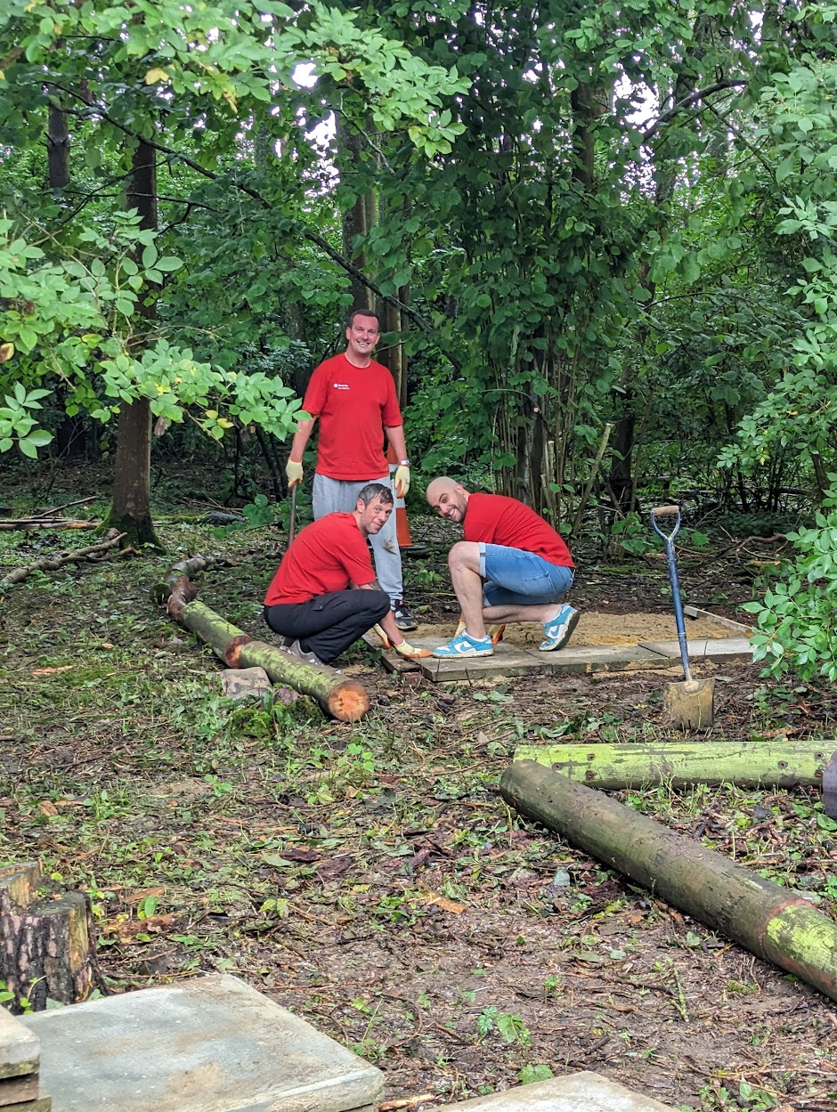 “Despite the weather, and an attack of Wasps after we accidentally disturbed a nest, it was such a productive day!”, said Caroline Hallett, our Service Development Manager. Further, she added, “Thank you so much to the hard-working teams at Swiss re, we have made a beautiful woodland walk, with Pixie cottages and giant 9ft high bears, I cannot wait to see what the children think of them when they come back in September.”