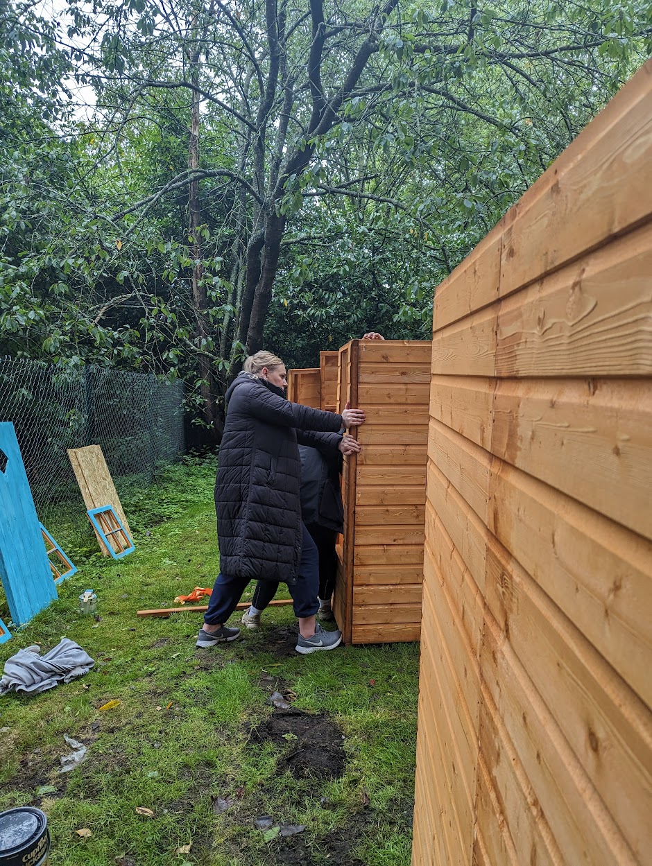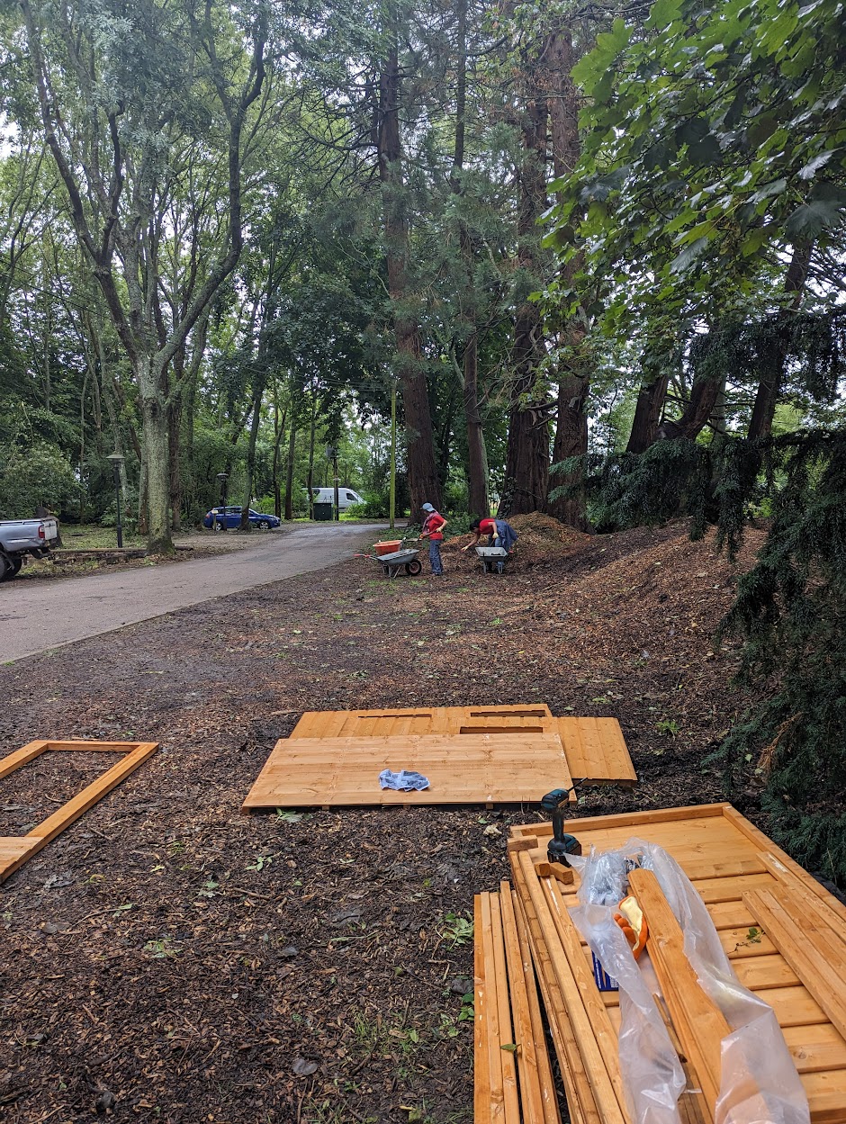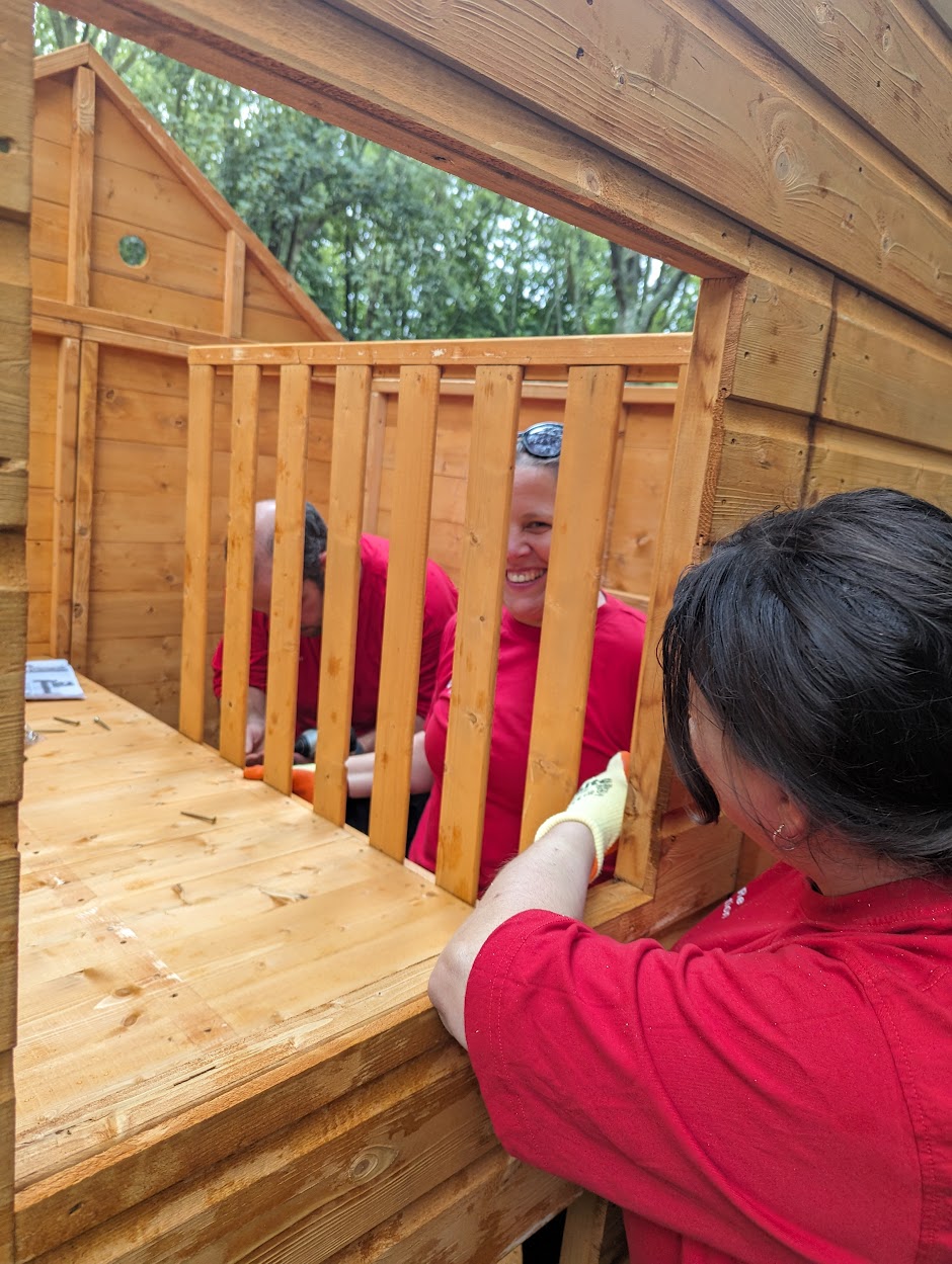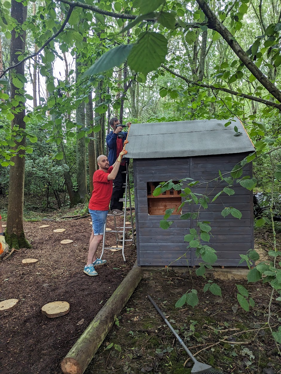 “Despite the weather, and an attack of Wasps after we accidentally disturbed a nest, it was such a productive day!”, said Caroline Hallett, our Service Development Manager. Further, she added, “Thank you so much to the hard-working teams at Swiss re, we have made a beautiful woodland walk, with Pixie cottages and giant 9ft high bears, I cannot wait to see what the children think of them when they come back in September.”