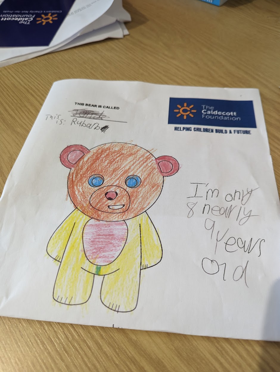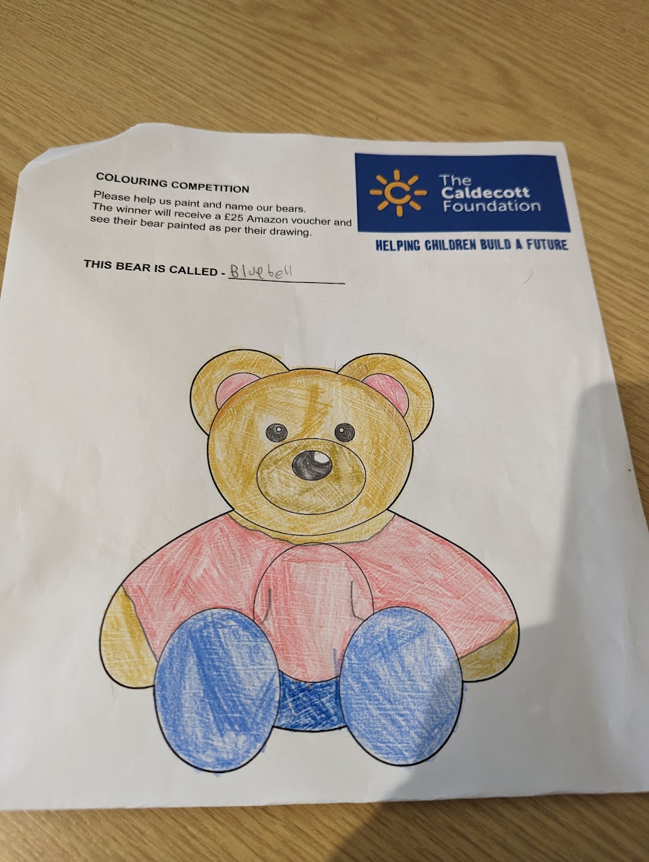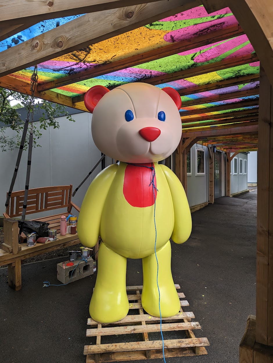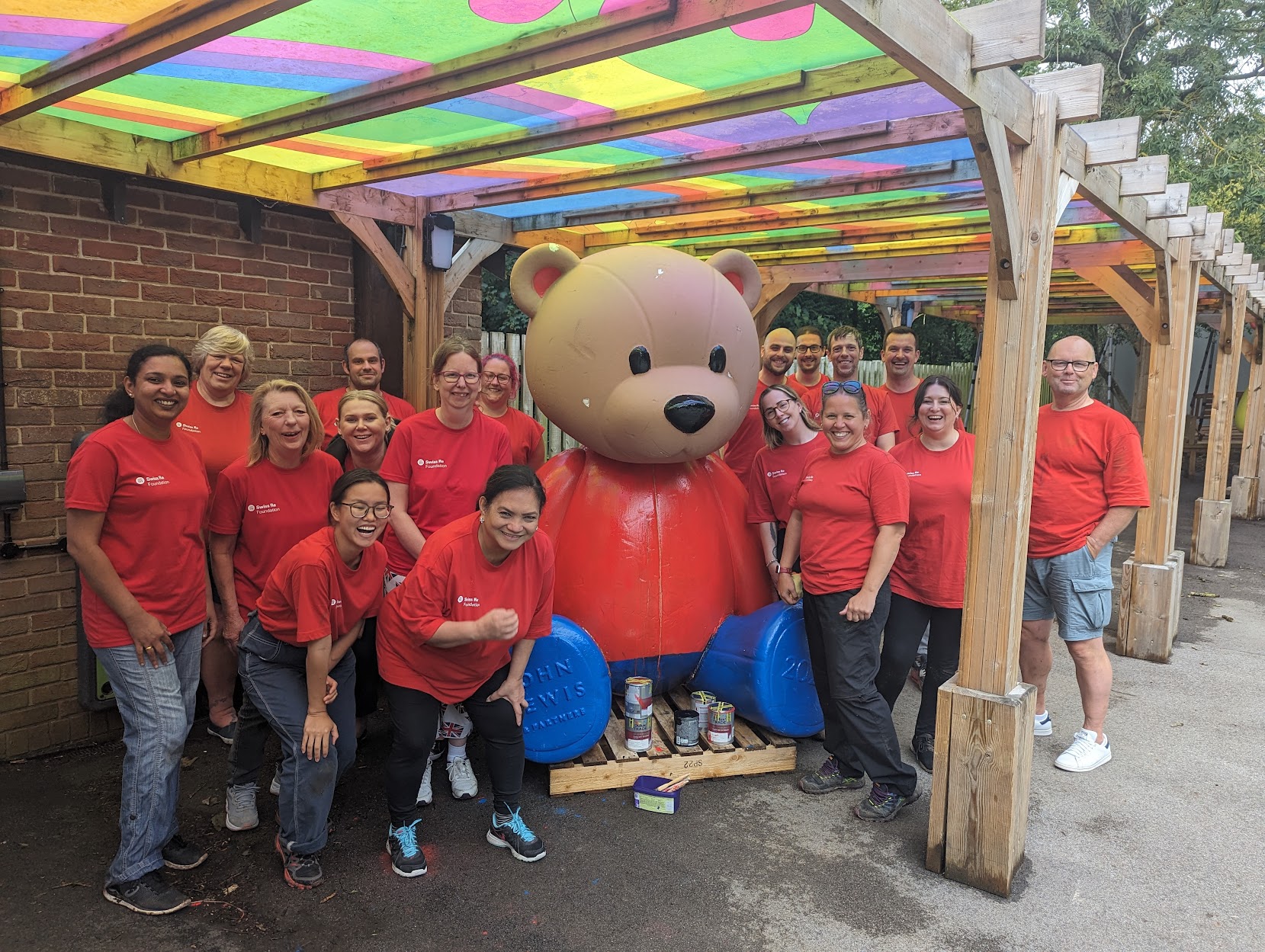 Earlier in the year, our friends at John Lewis Partnership donated two 9-ft high bears, which were from their window displays, and the children took part in a competition to design a colour scheme and name the bears. The two winning designs were then faithfully painted by our Swiss Re Volunteers. Staff from the Caldecott Foundation joined in on the day to contribute to the team effort.