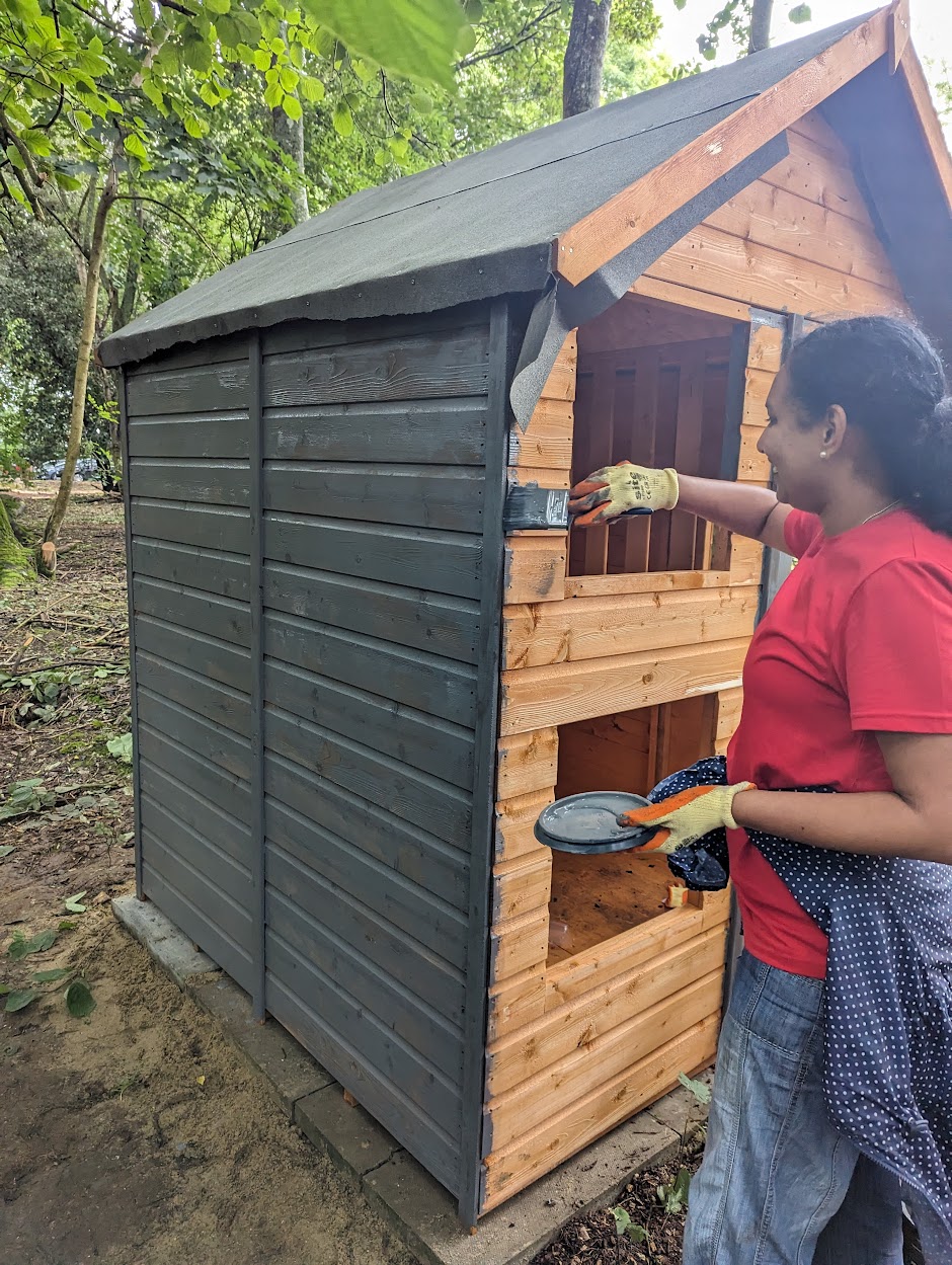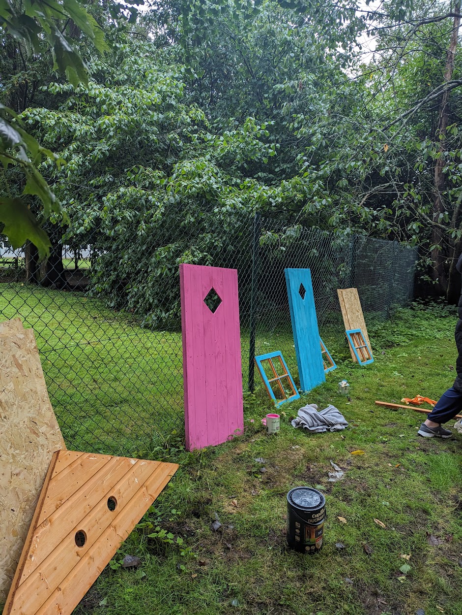 The woodlands around our Primary school and children’s homes have had some very special Pixies and Bears move in – thanks to our friends from the Swiss Re Foundation. Colleagues from the UK Swiss Re offices in Folkestone came together to donate their time this summer for a Community Day. We were not lucky with the weather as it rained all day, but this did not stop our brave band of volunteers who carried on regardless, volunteering their time and energy to clearing forest paths, laying down paving slabs and bark, and building 4 large Pixie playhouses in the wood, which were then painted.